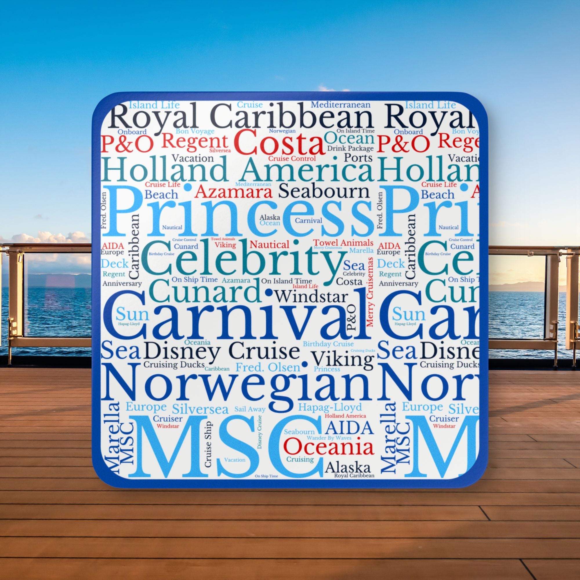 Showcase your passion for cruising with this colorful Cruise Words Coaster Set, featuring the names of top cruise lines in a bold word-cloud design. The high-gloss MDF top delivers vibrant detail, while the cork back keeps your surfaces protected and your drinks steady.