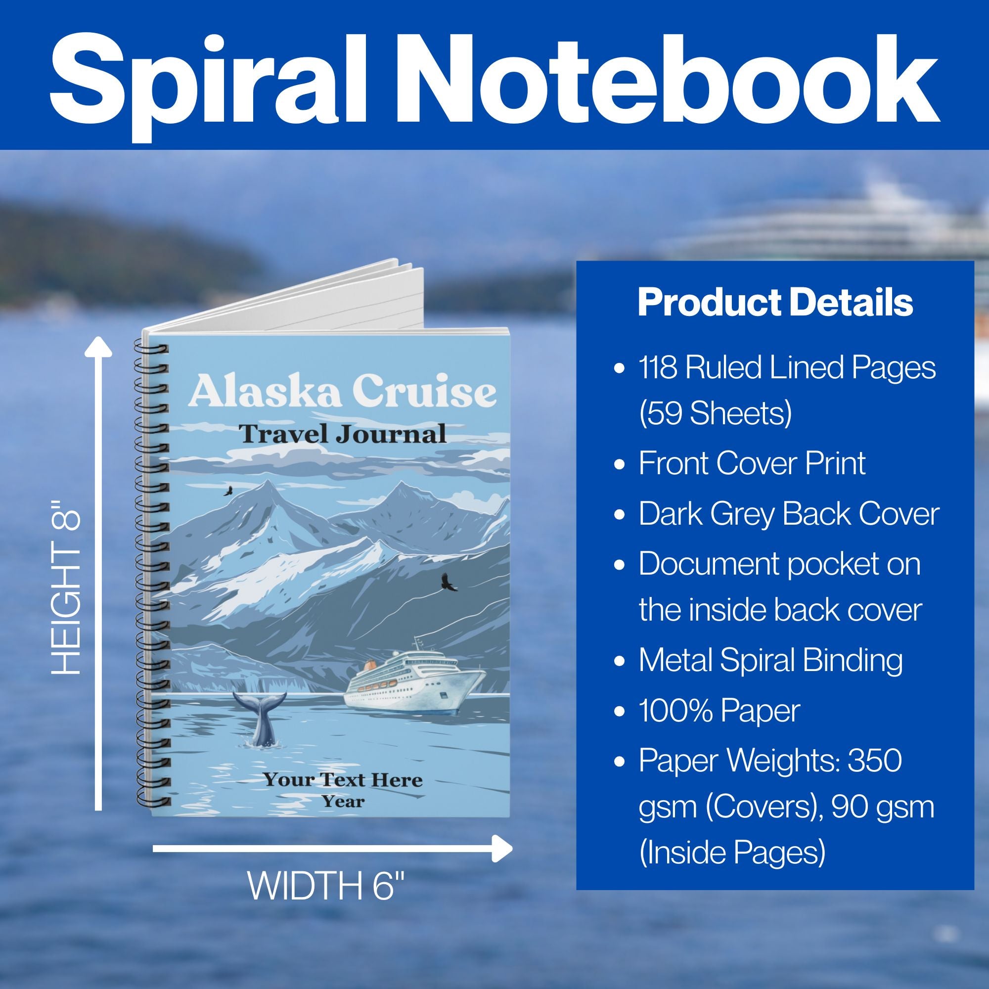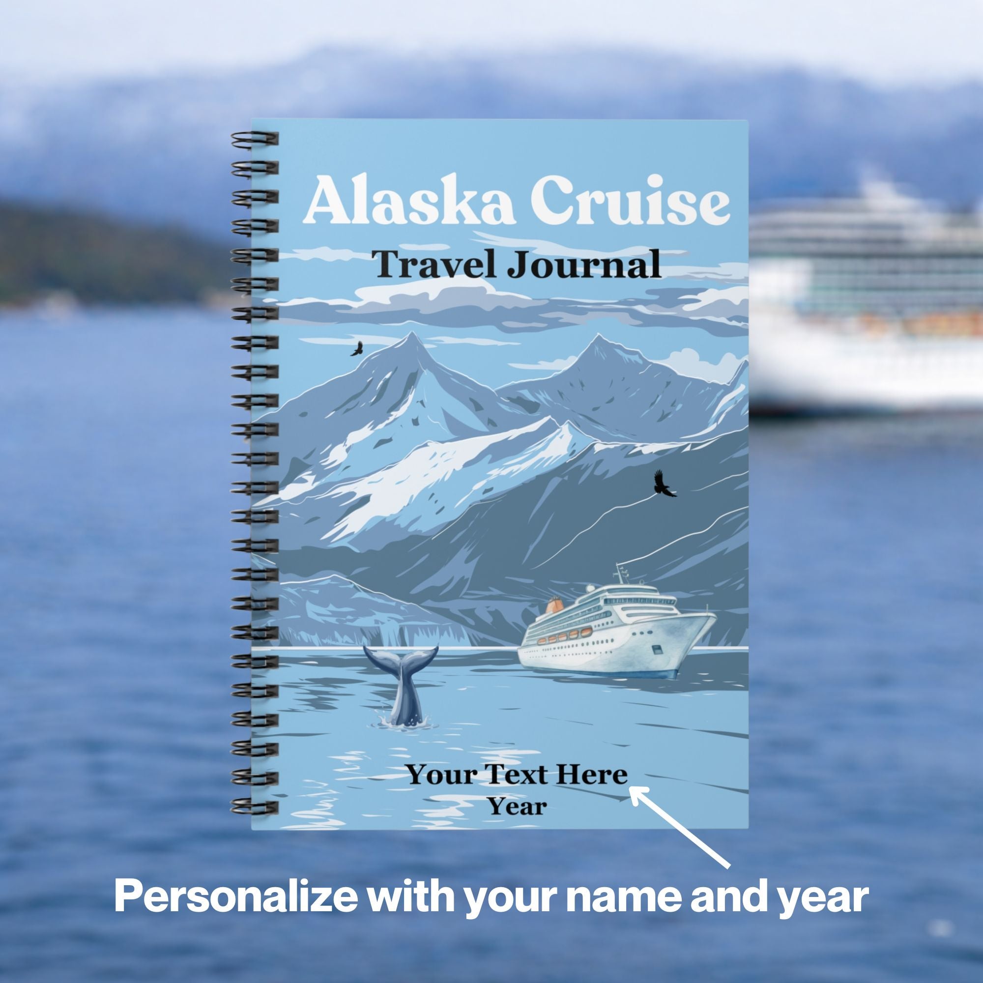Personalize the bottom of the cover with your name, a special message, and your cruise year to create a meaningful souvenir you’ll treasure long after your voyage ends. Whether you're documenting glacier views, wildlife sightings, shore excursions, or daily memories at sea, this journal is the perfect companion for your Alaska cruise.