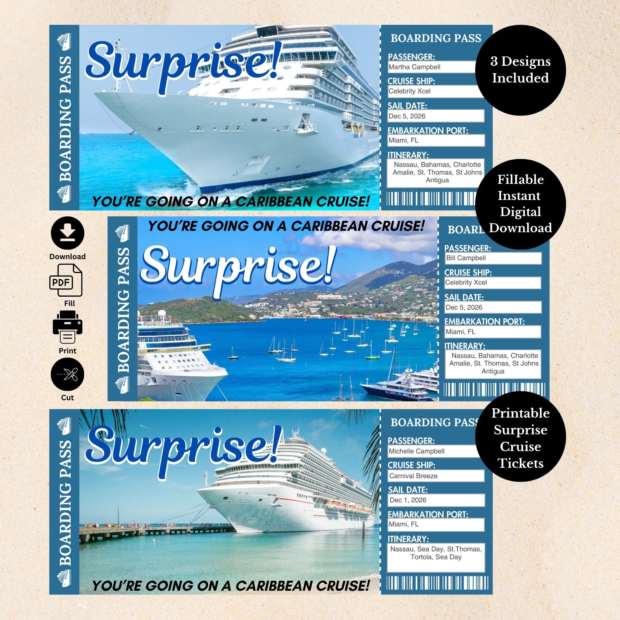 This printable digital PDF download contains 3 different fillable Caribbean Cruise Ticket Boarding Passes.