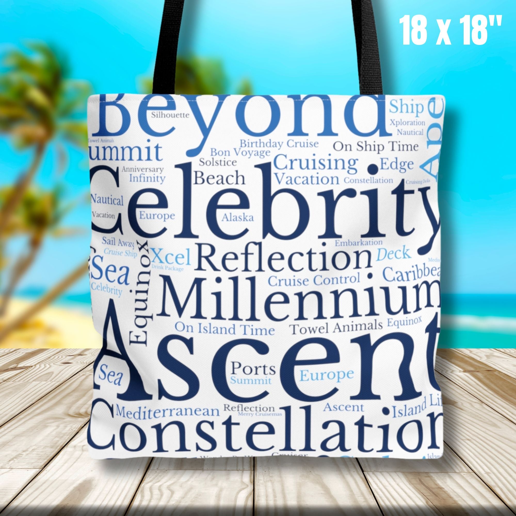 Our Celebrity Cruise Tote Bag is the perfect companion for cruise ship enthusiasts! Designed with a love for all things cruising, this tote bag features a delightful print of Celebrity Cruises themed words that will transport you to the excitement of the open sea!