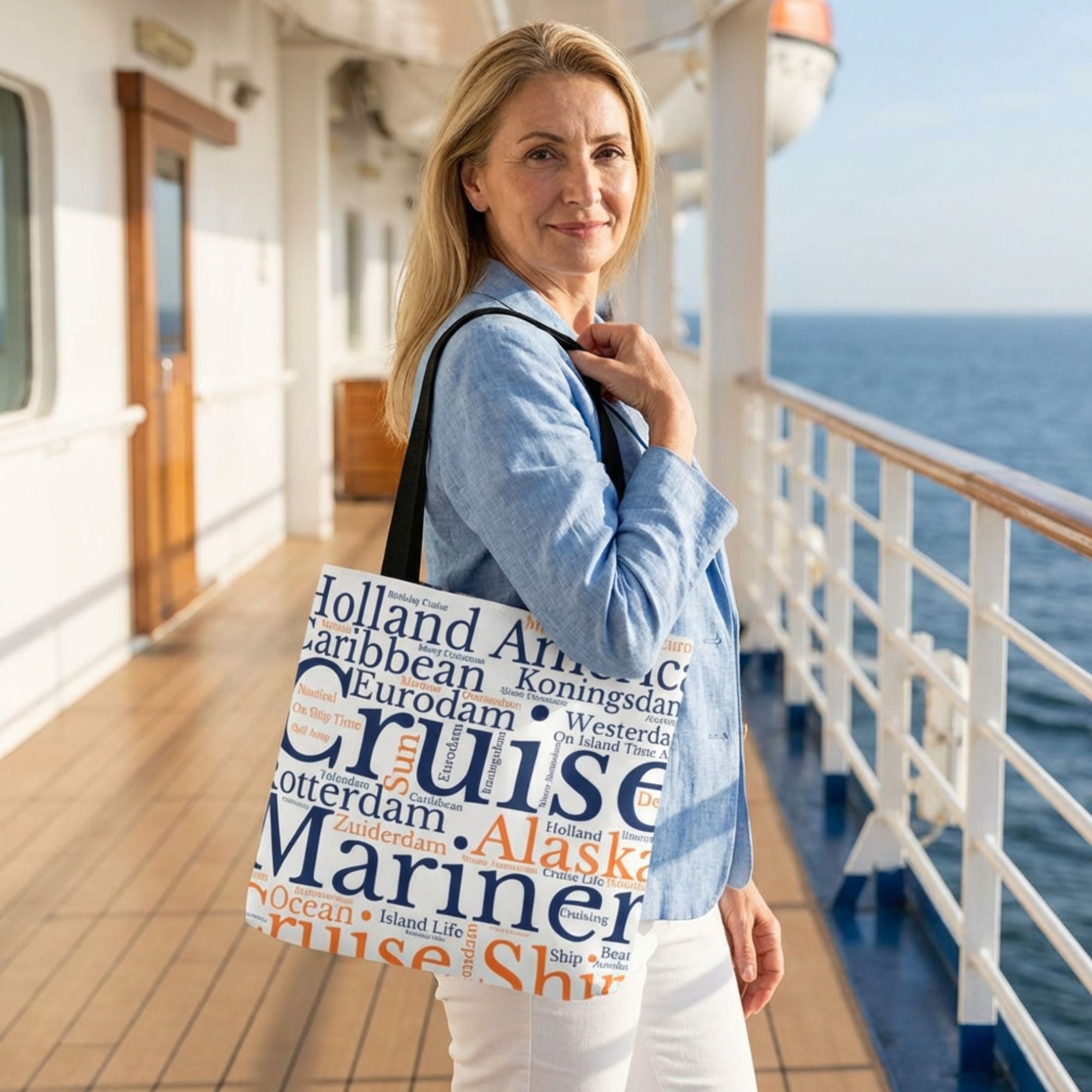 Our Holland America Cruise Tote Bag is the perfect companion for cruise ship enthusiasts! Designed with a love for all things cruising, this tote bag features a delightful print of Holland America Cruise words that will transport you to the excitement of the open sea!