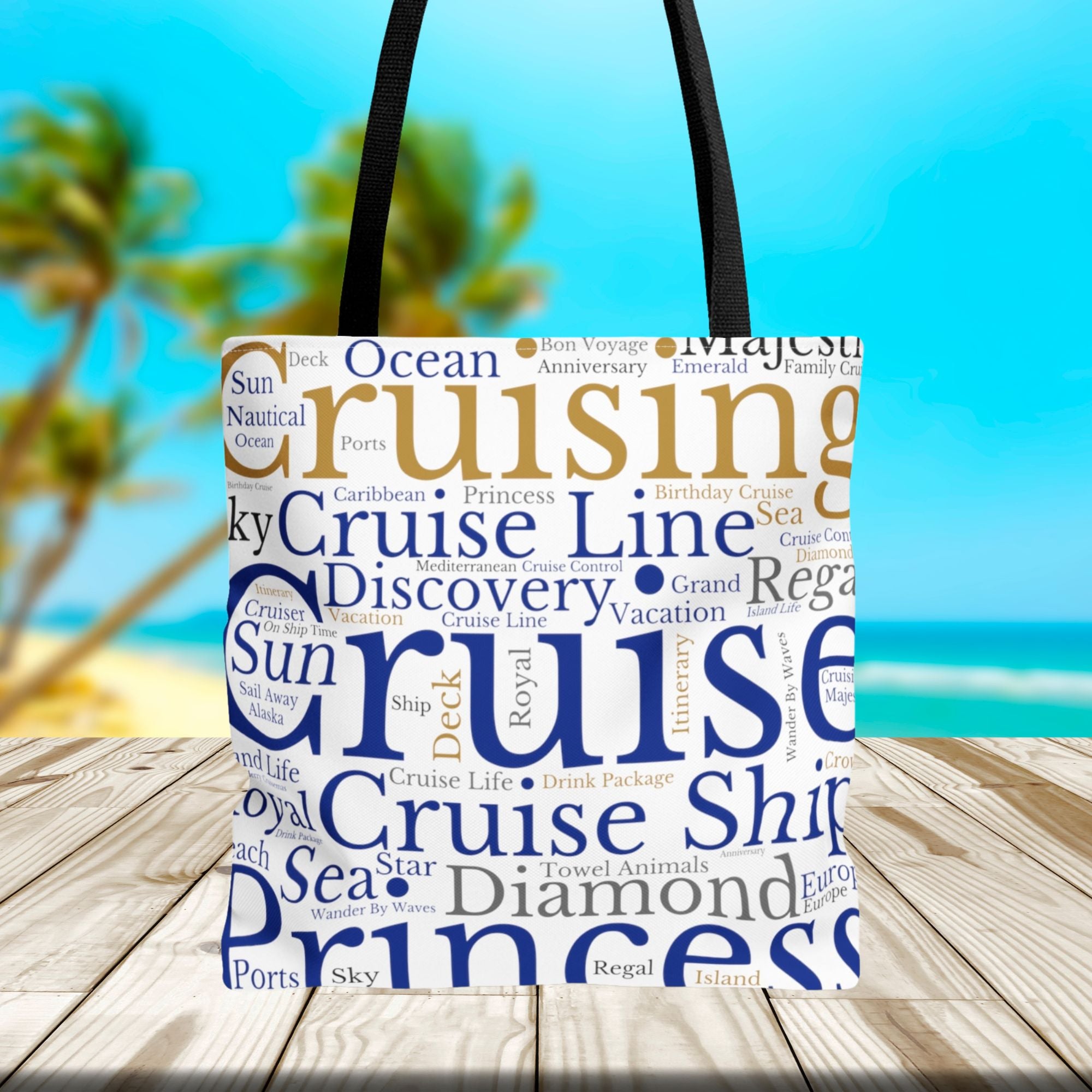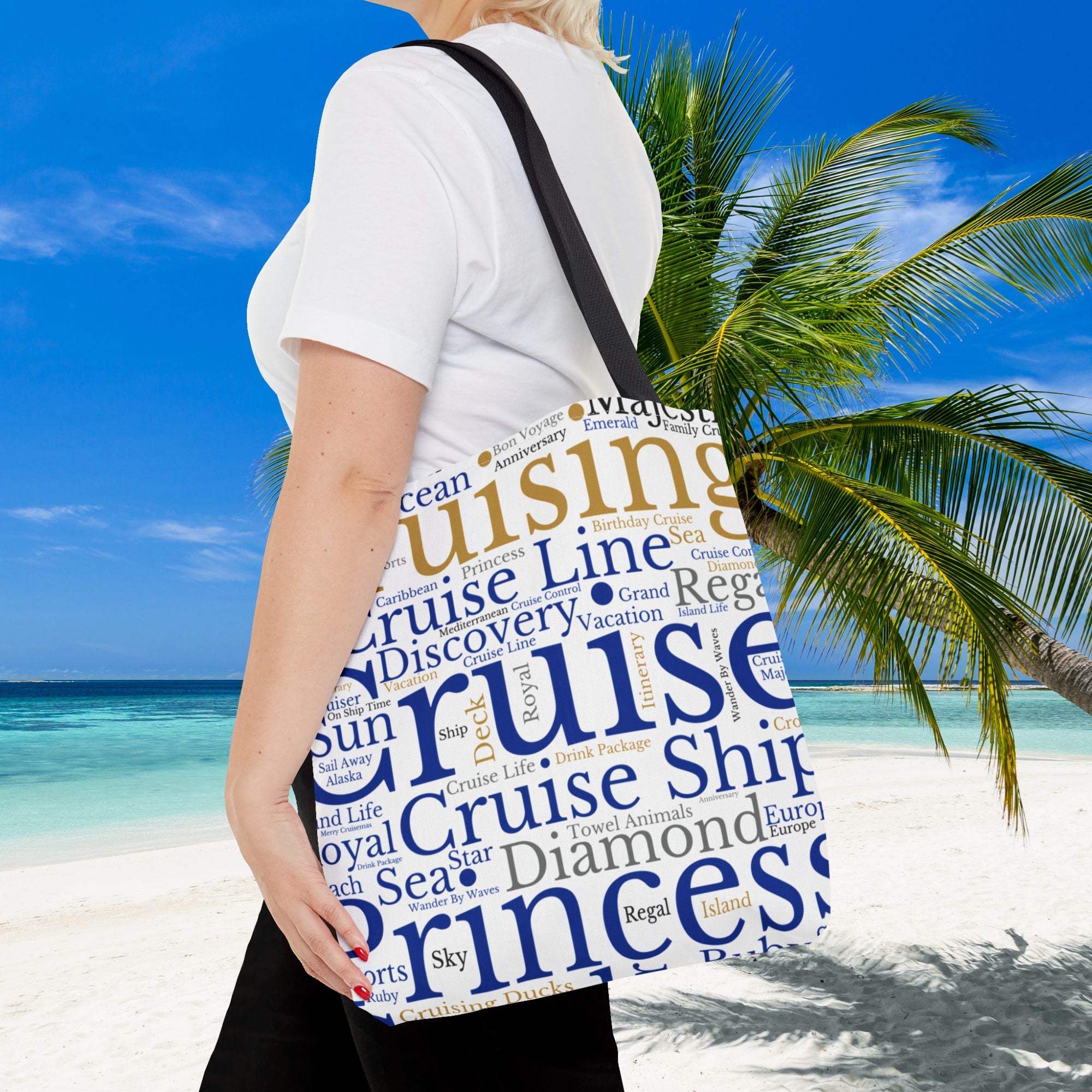 Our Princess Cruise Tote Bag is the perfect companion for cruise ship enthusiasts! Designed with a love for all things cruising, this tote bag features a delightful print of Princess Cruise themed cruise words that will transport you to the excitement of the open sea!